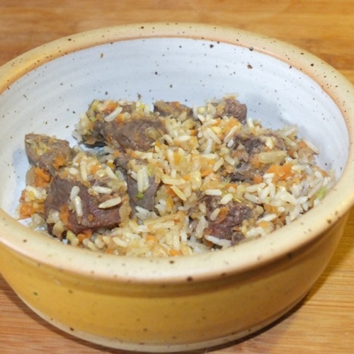 - Das gewürfelte Fleisch in etwas Öl in der Pfanne bei nicht allzu hoher Temperatur ca. 5 Minuten schmoren, dann Gemüsemix zugeben und etwa 2 weitere Minuten unter rühren mitschmoren. Zum Schluss den Reis zugeben und gleichmässig im Gemüse-Fleisch-Mix verteilen.