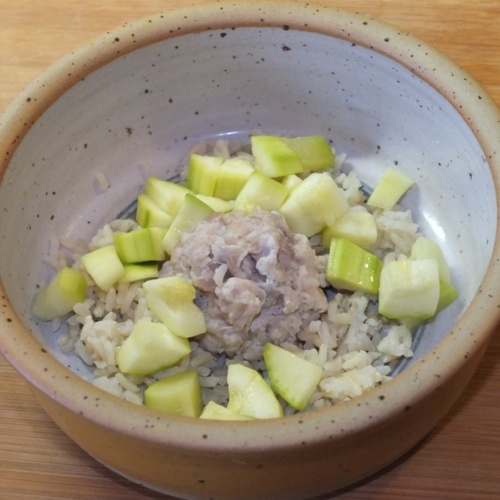 Gekochte Fleischbällchen sind für Hunde natürlich die „Oberleckerei“. Zusammen mit dem Reis und den Zucchini-Würfeln bilden sie eine tolle, schmackhafte Mahlzeit. Gemüse gewürfelt geht natürlich nur, wenn es gegart wird. Rohes Gemüse muss immer geschreddert oder püriert werden, sonst hat der Hund nichts von den enthaltenen Nährstoffen.