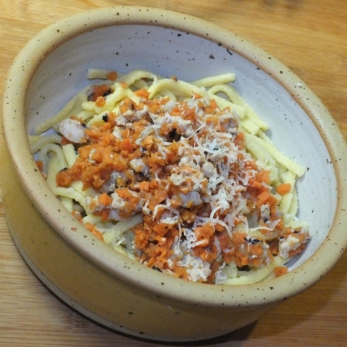 - Wie bei der Rohfütterung Fleisch-Gemüsemix auf die Nudeln geben und auf die Mahlzeiten aufteilen. Parmesan darüber reiben und Ergänzungen kurz vor der Fütterung zugeben.