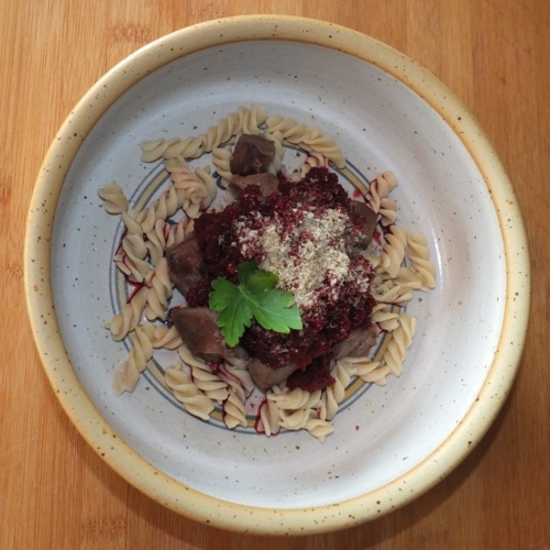 Rinderherzgulasch mit Dinkelnudeln und SBK-Topping