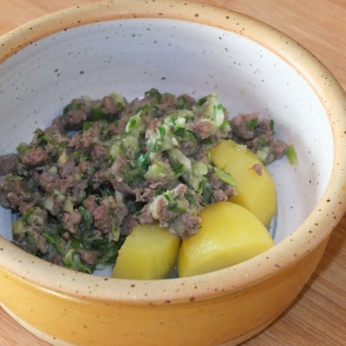 - Gemüse-Fleisch-Mix mit den Kartoffeln vermischen und auf die Mahlzeiten aufteilen. Ergänzungen kurz vor der Fütterung zugeben.